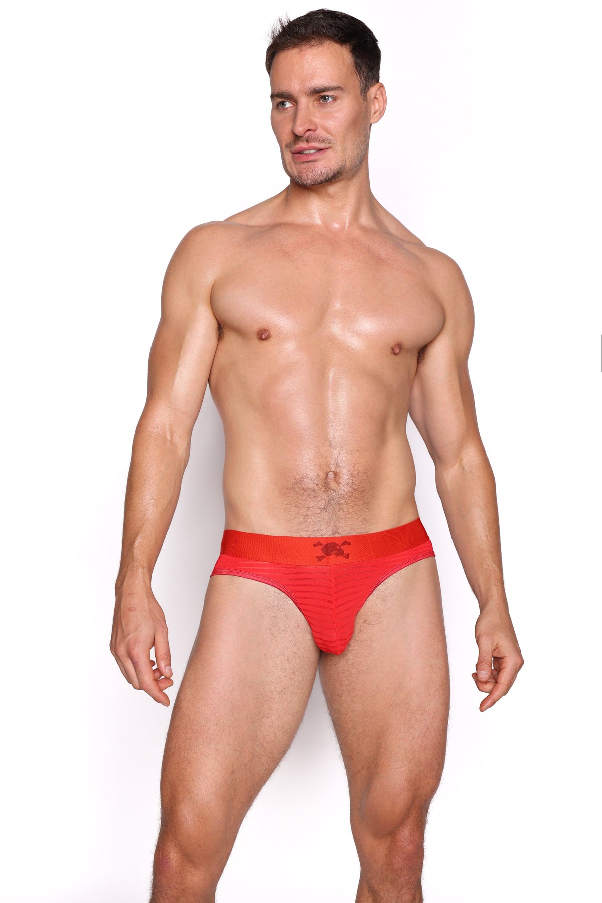 Our new addition to Just the Bones collection comes in a super soft & lightweight sheer mesh fabric.  This Skull & Bones brief silhouette features a contour pouch, a non-role waistband, and flatlock stitching throughout for stretchability and uninhibited movement.  Features our signature logo on the waistband.
